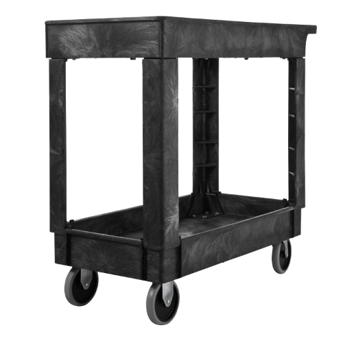 The Rubbermaid Commercial Utility Cart with 2 Lipped shelves, Medium, is constructed of sturdy structural foam that will not dent, chip, or peel. Deep, lipped shelves help keep up to 500 lbs. of materials secure when the cart is rolling, so tools and supplies won't slip or slide off. Crafted with rounded corners to protect walls and furniture, this rolling cart has 5" non-marking swivel casters for lightweight maneuverability. With handle compartments for additional storage, molded fittings for rolled supplies, an easy-access lipped bottom shelf, and a lipped top shelf, this is a versatile and indispensable utility cart for any facility.